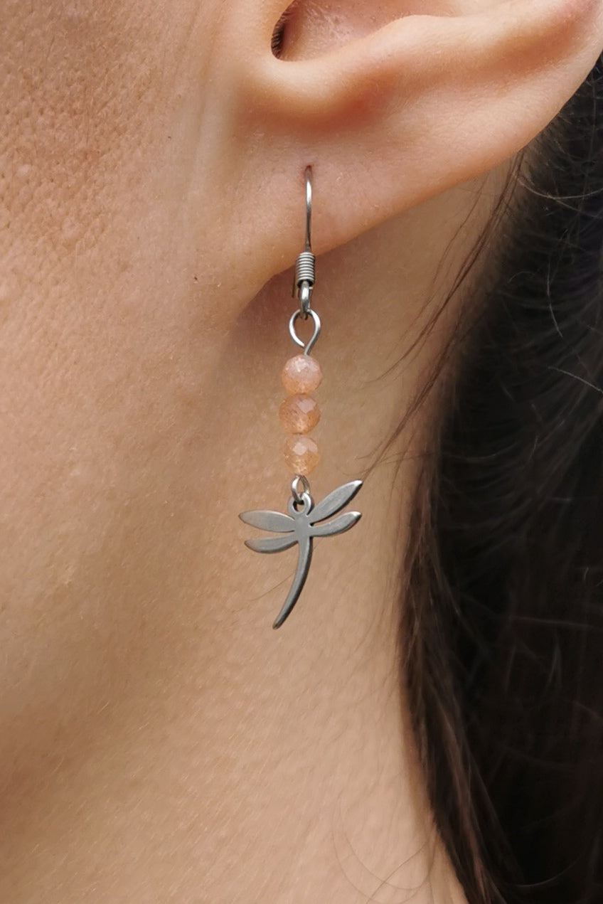 Boucles d'oreilles Libellule La Rose Nomade en acier inoxydable durable et hypoallergénique. Pierre de Soleil. Joie de vivre, confiance et protection.