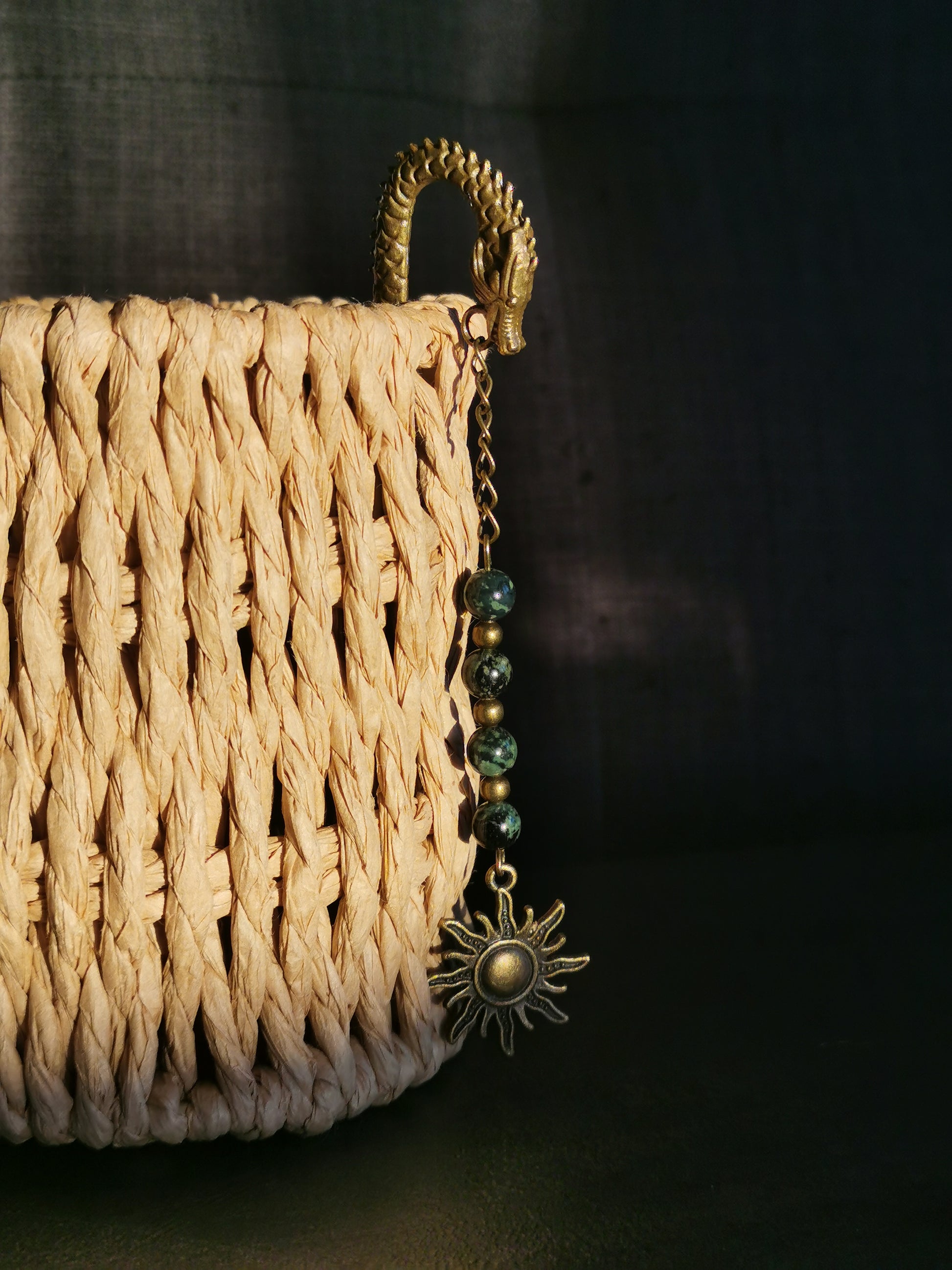 Marque pages Dragon en bronze et jaspe kambaba avec médaillon Soleil. Le jaspe kambaba est souvent associé à la protection, à la stabilité émotionnelle et à l’ancrage, aidant à surmonter les peurs et à renforcer la confiance en soi. Il est également réputé pour favoriser la connexion à la nature et à la Terre, tout en stimulant la créativité et la croissance personnelle. Certains lui attribuent des vertus purifiantes, tant sur le plan physique que spirituel, en aidant à éliminer les énergies négatives et à harmoniser les chakras, notamment le chakra racine. Atténue le stress.