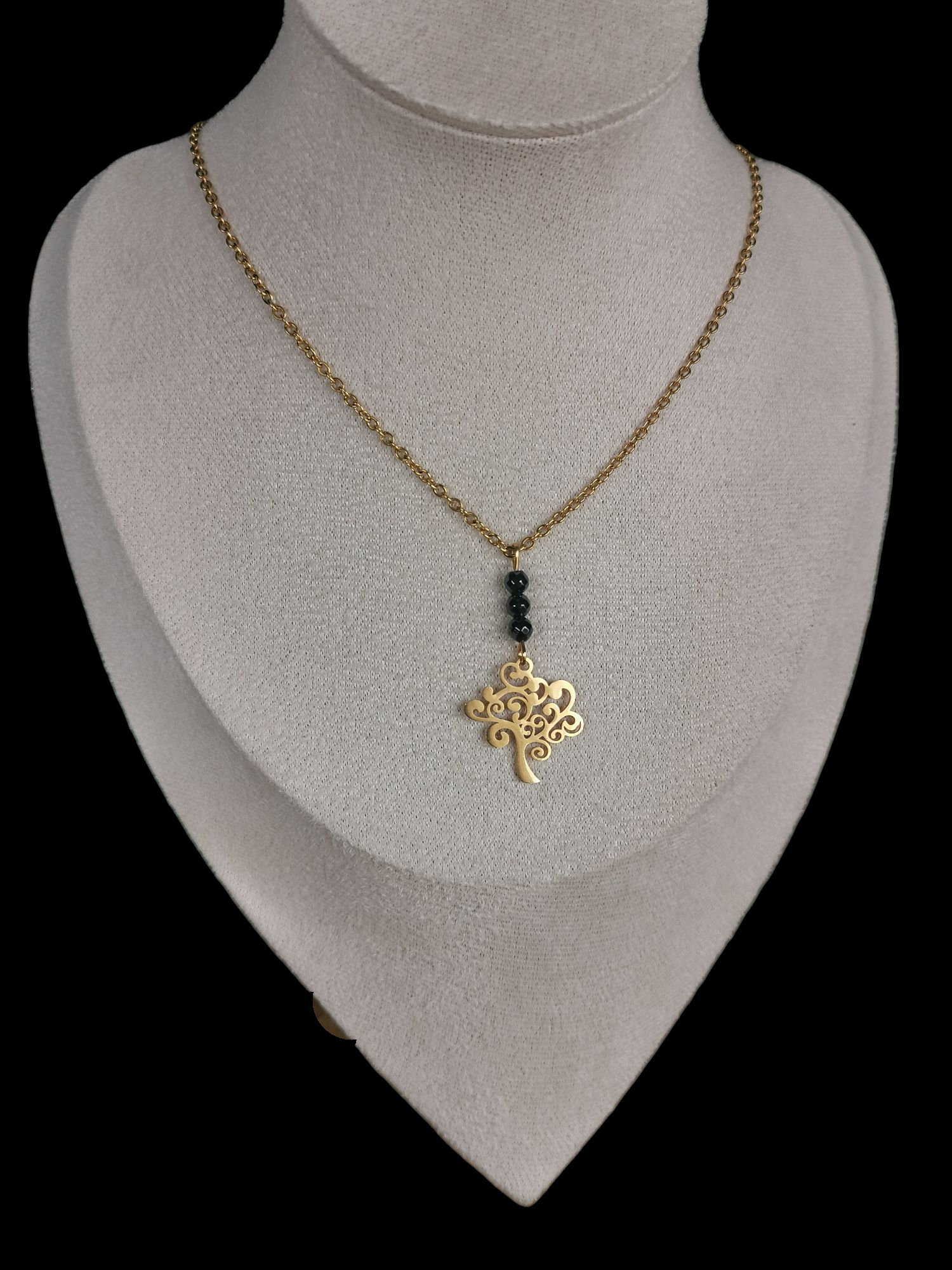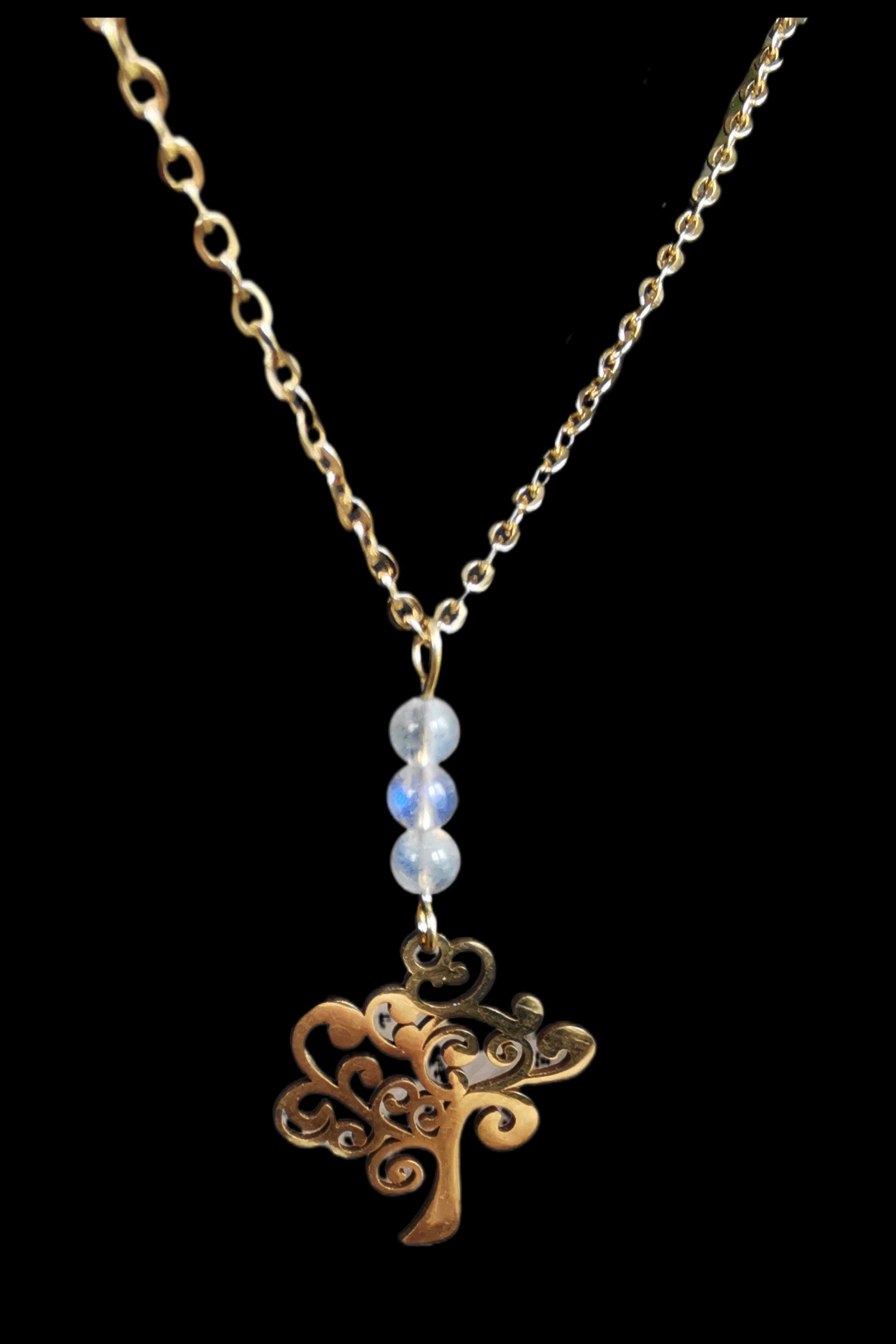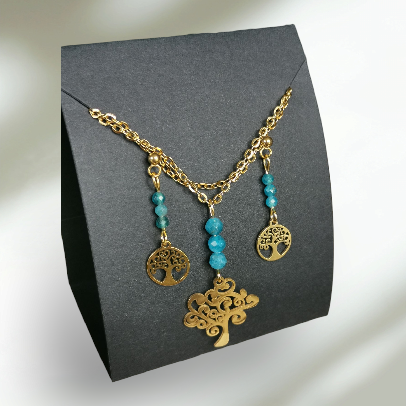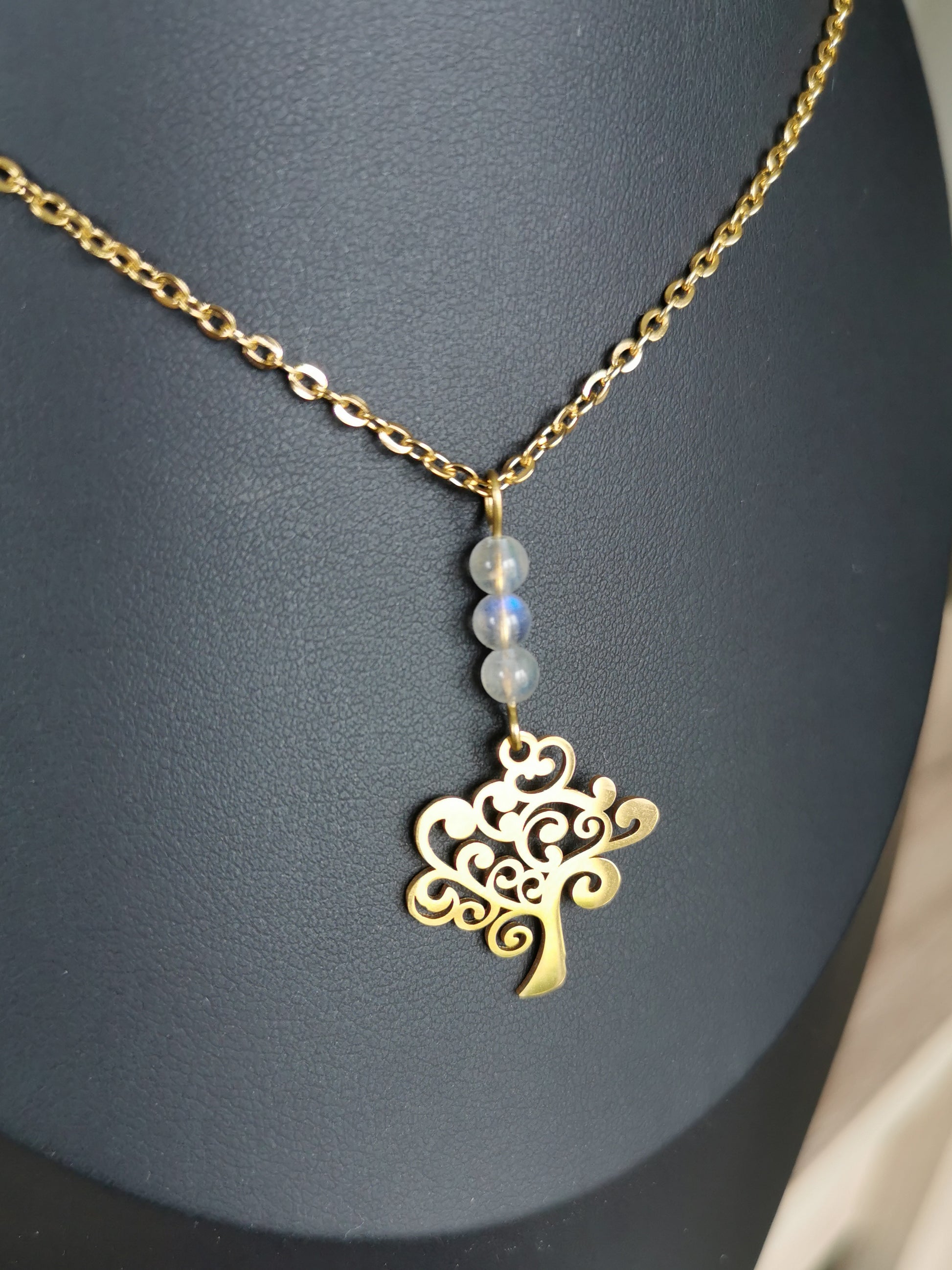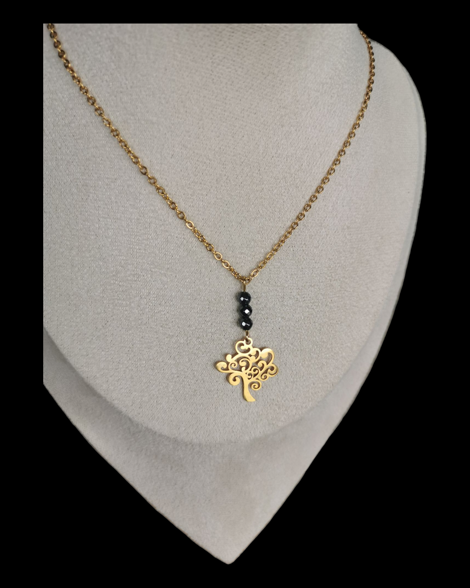 Symbole d’unité et de lien entre les mondes, l’arbre de vie s’élève ici avec délicatesse, dans une parure inspirée des rythmes de la nature. Ses branches évoquent la croissance, ses racines l’ancrage, et son tronc l’équilibre entre terre et ciel. Je l’ai imaginée comme une invitation à se reconnecter à soi, à puiser dans la force tranquille des éléments.