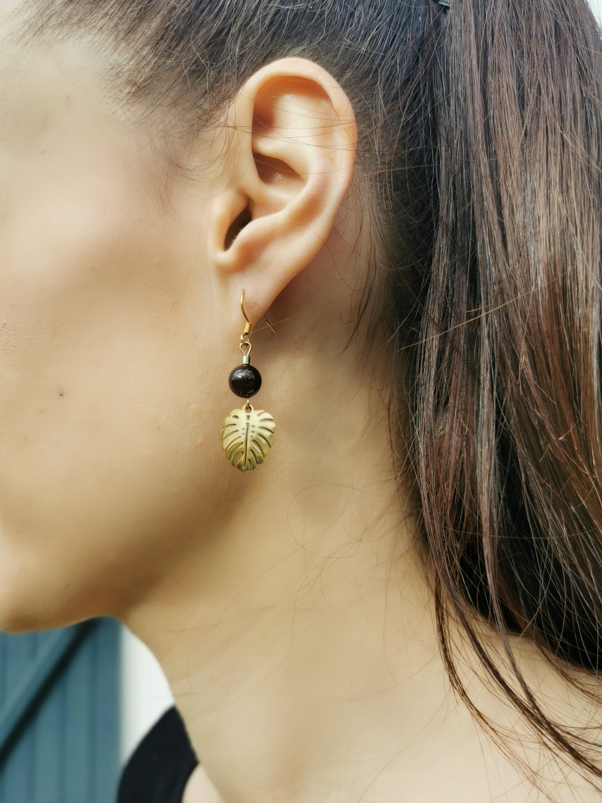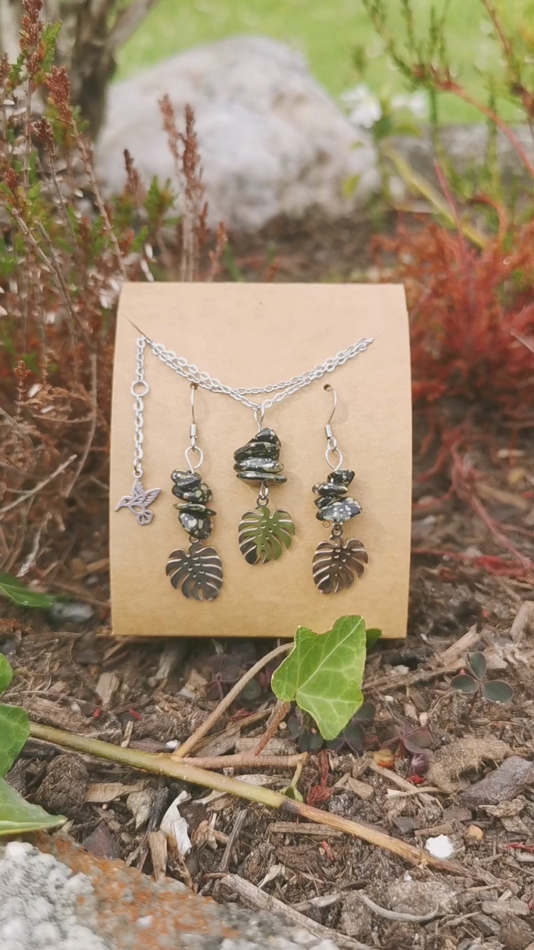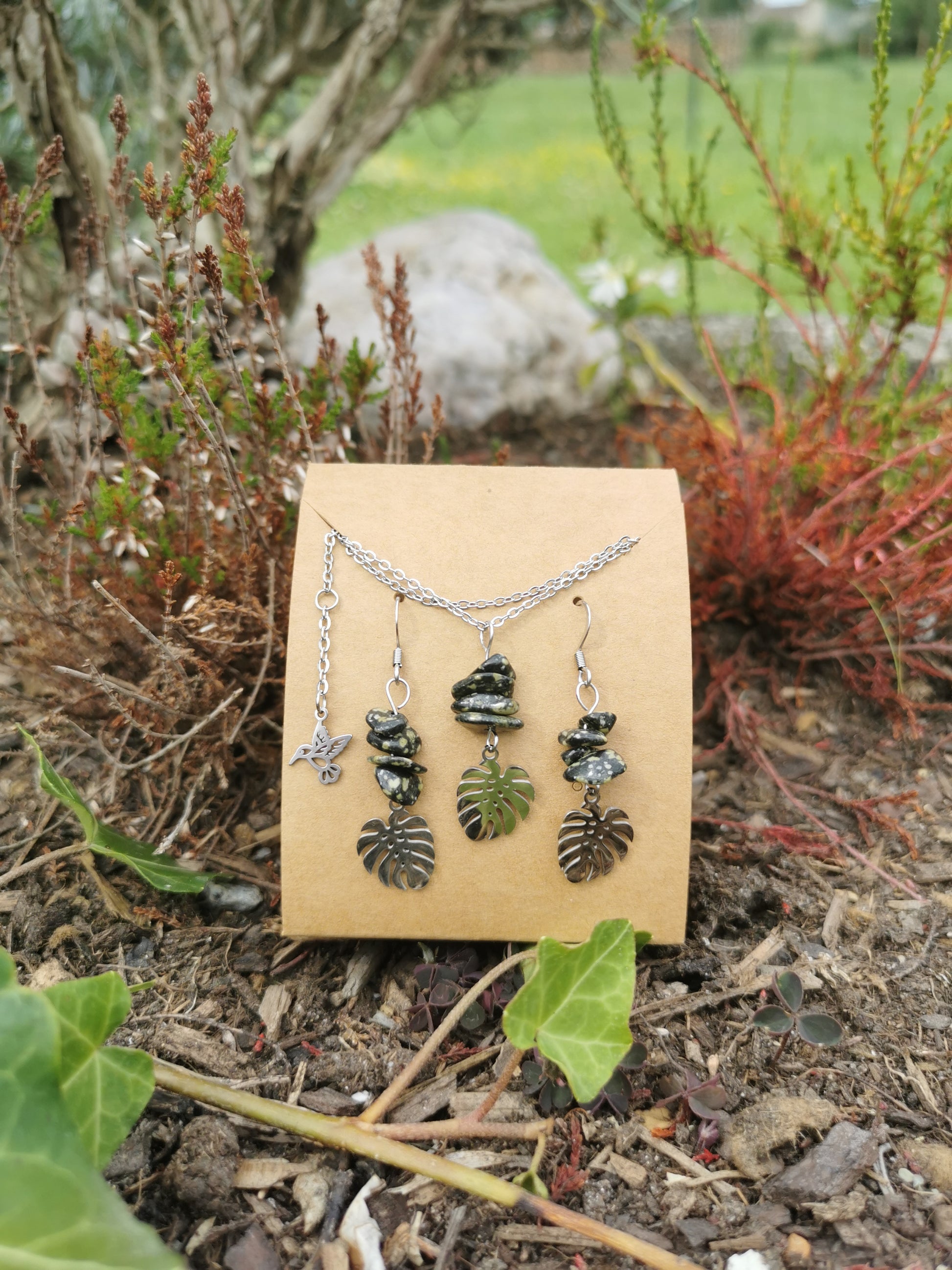 Parure Collier Boucles d'oreilles avec pendentif feuille de monstera. Collier réglable avec bout de chaîne colibri. Couleur vert sombre et vert clair. Acier inoxydable durable et hypoallergénique. Boucles d'oreilles avec petits crochets à enfiler.