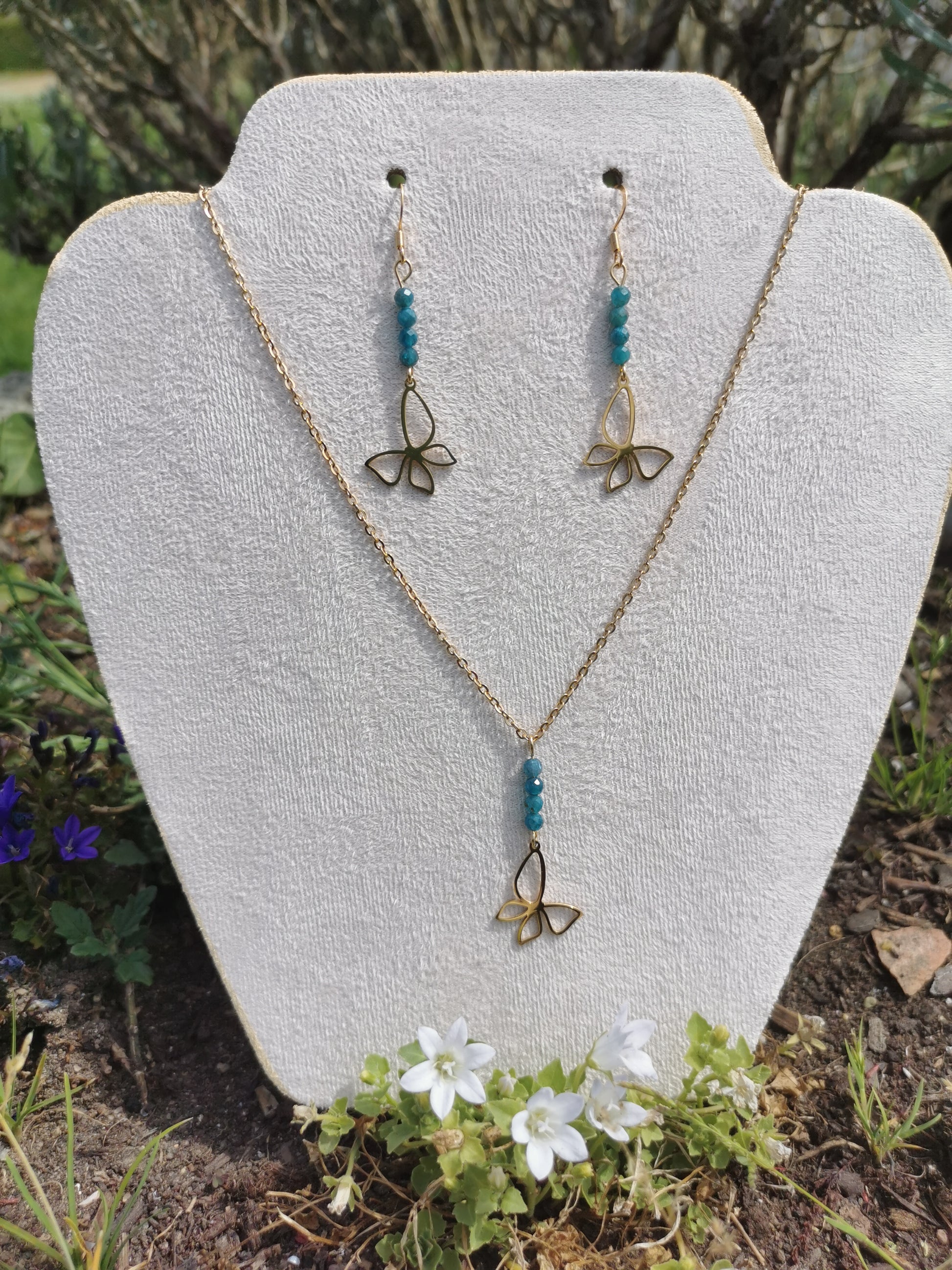 Parure Collier boucles d'oreilles en acier inoxydable doré durable et hypoallergénique pendentif papillon et apatite bleue facettée 3mm.