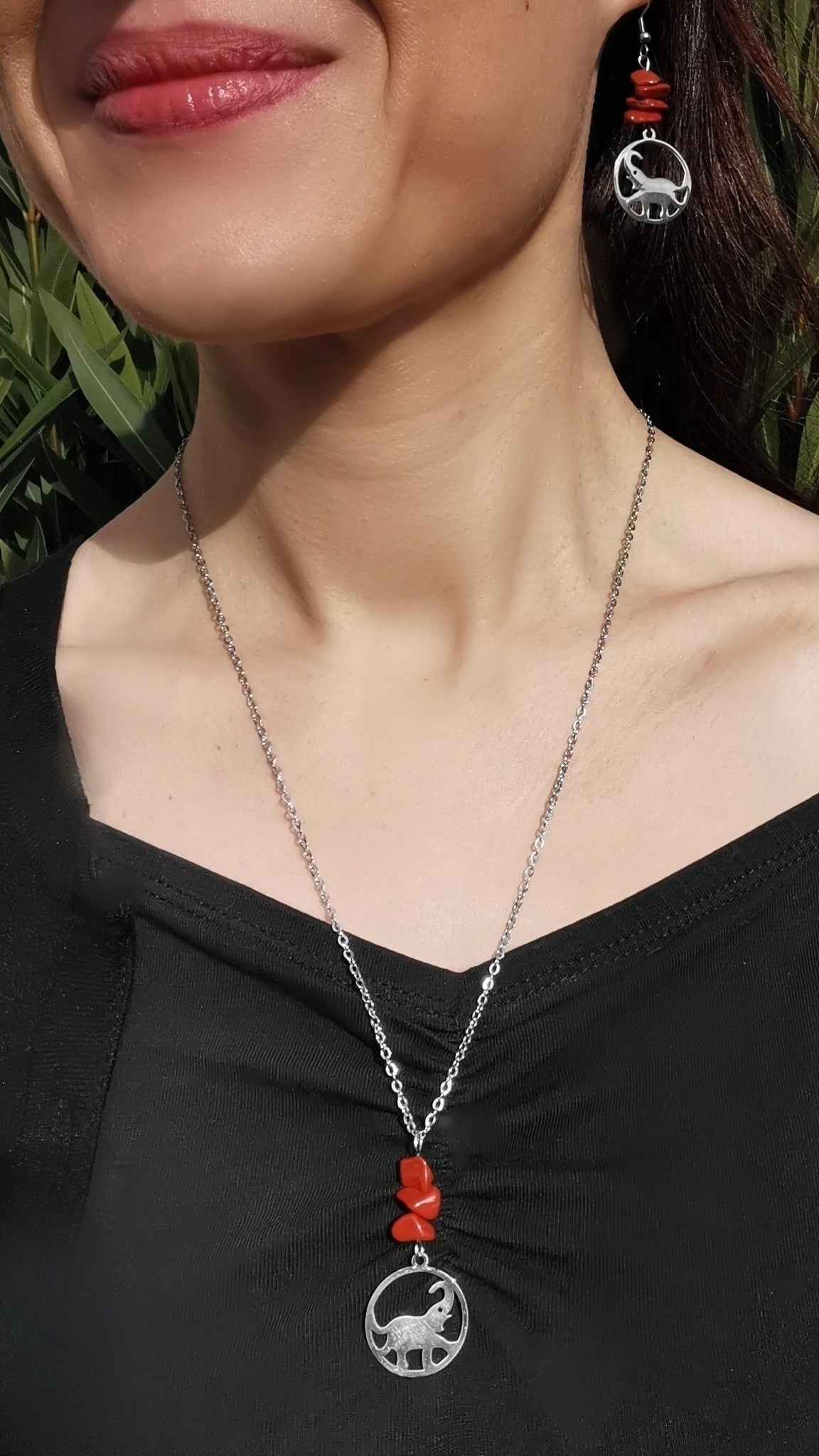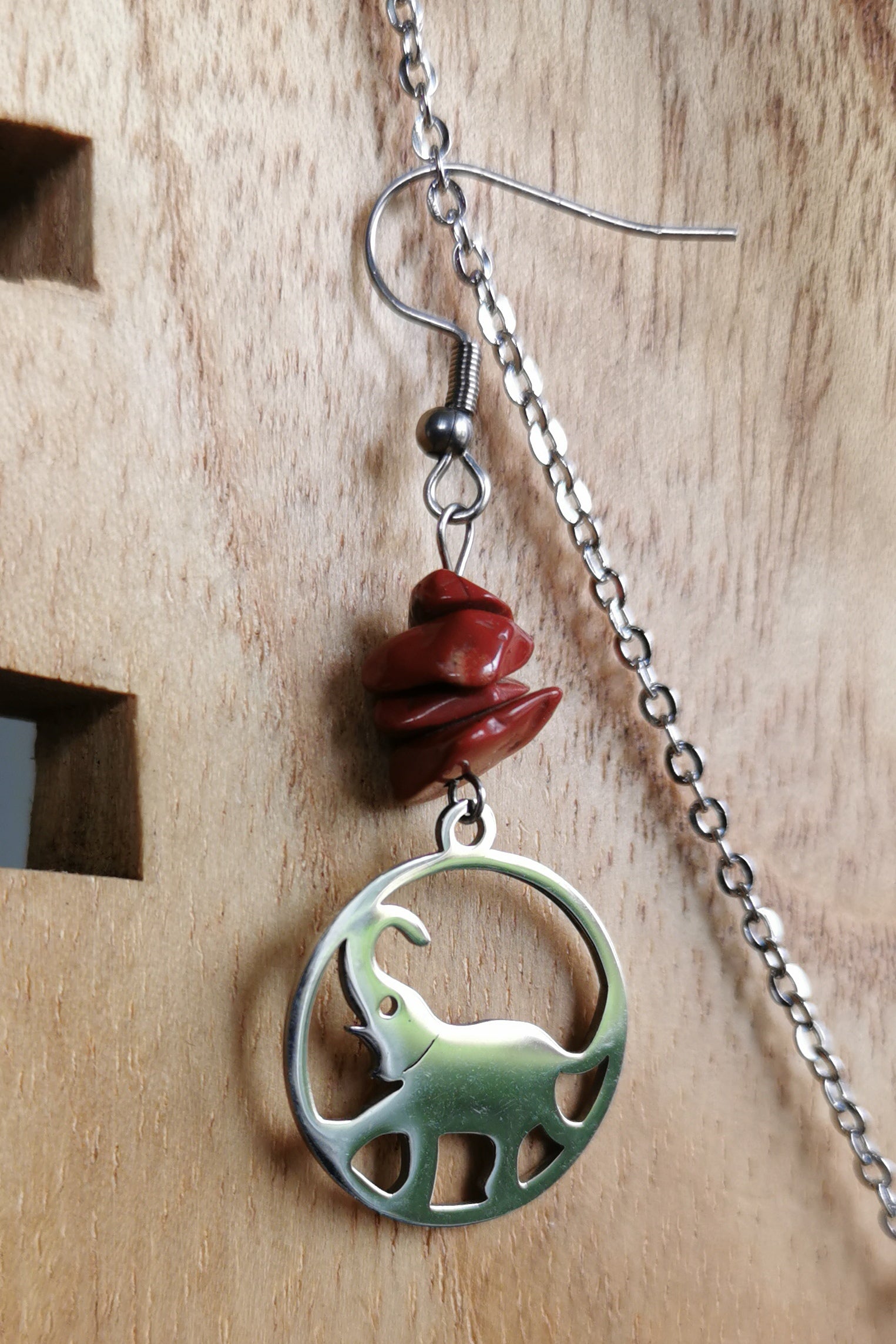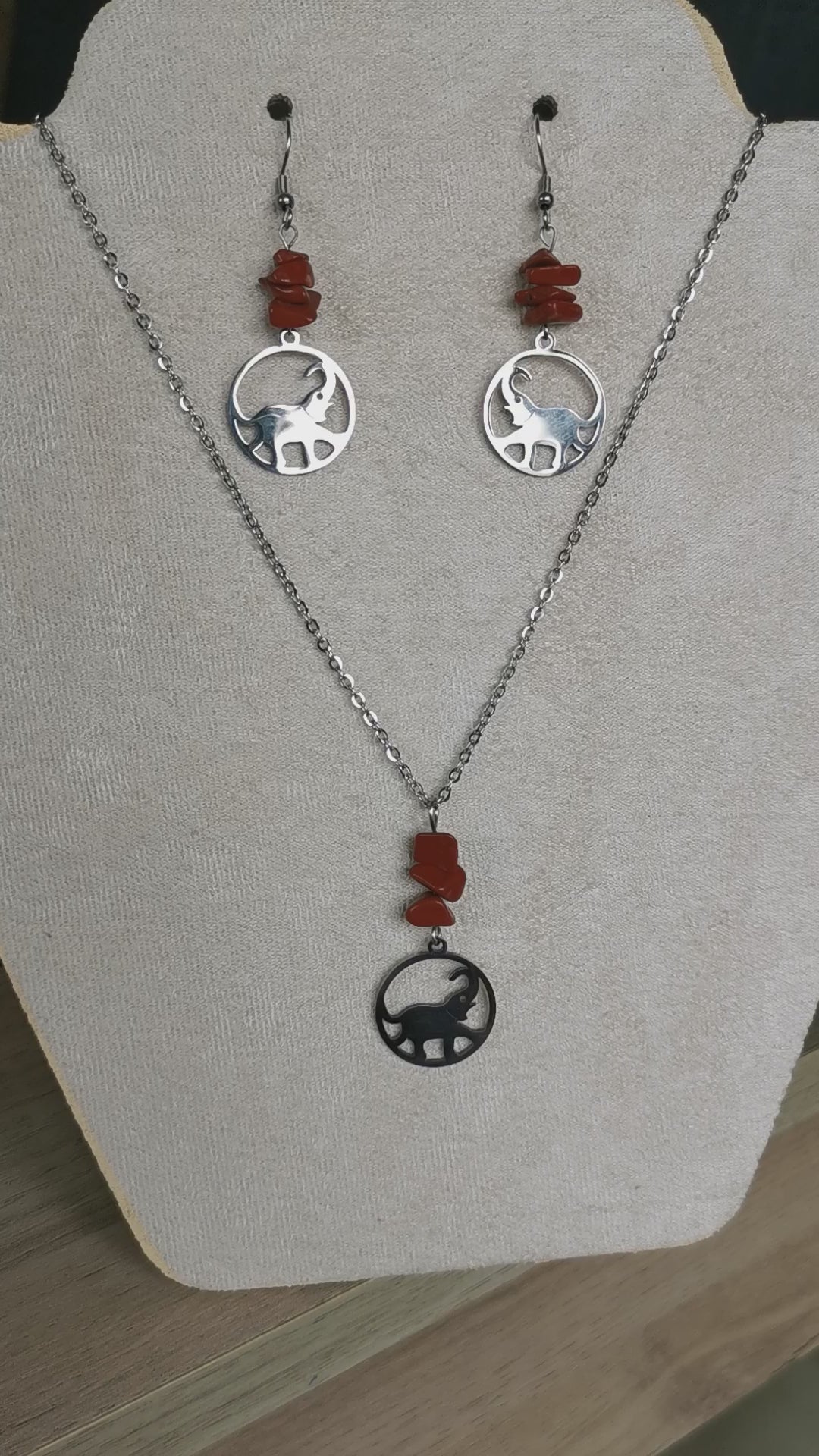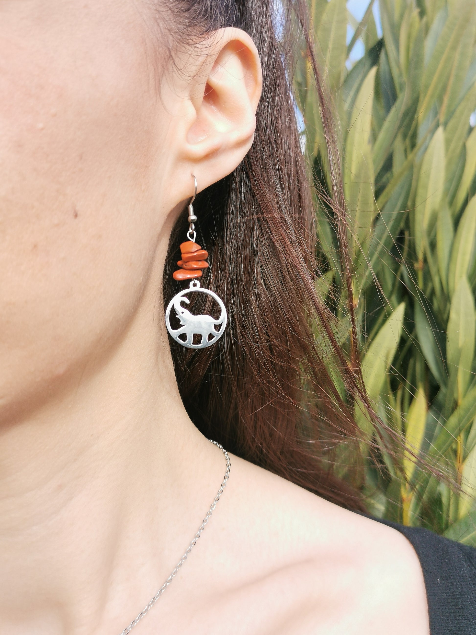 Parure Collier et Boucles d'oreilles pendentif éléphant et perles plates en jaspe rouge. Système d'accroche : crochets à enfiler. Collier long.